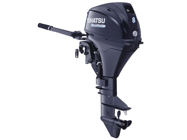 The Tohatsu 8 HP Outboard Motor model # MFS8BEFL is a two cylinder, 4 stroke outboard motor which comes equipped with the 20 inch long shaft and tiller steering. For convenience this model has both rope and electric start. At just a little over 90lbs the motor is easily portable. Tohatsu motors are known for being quiet and gas frugal.